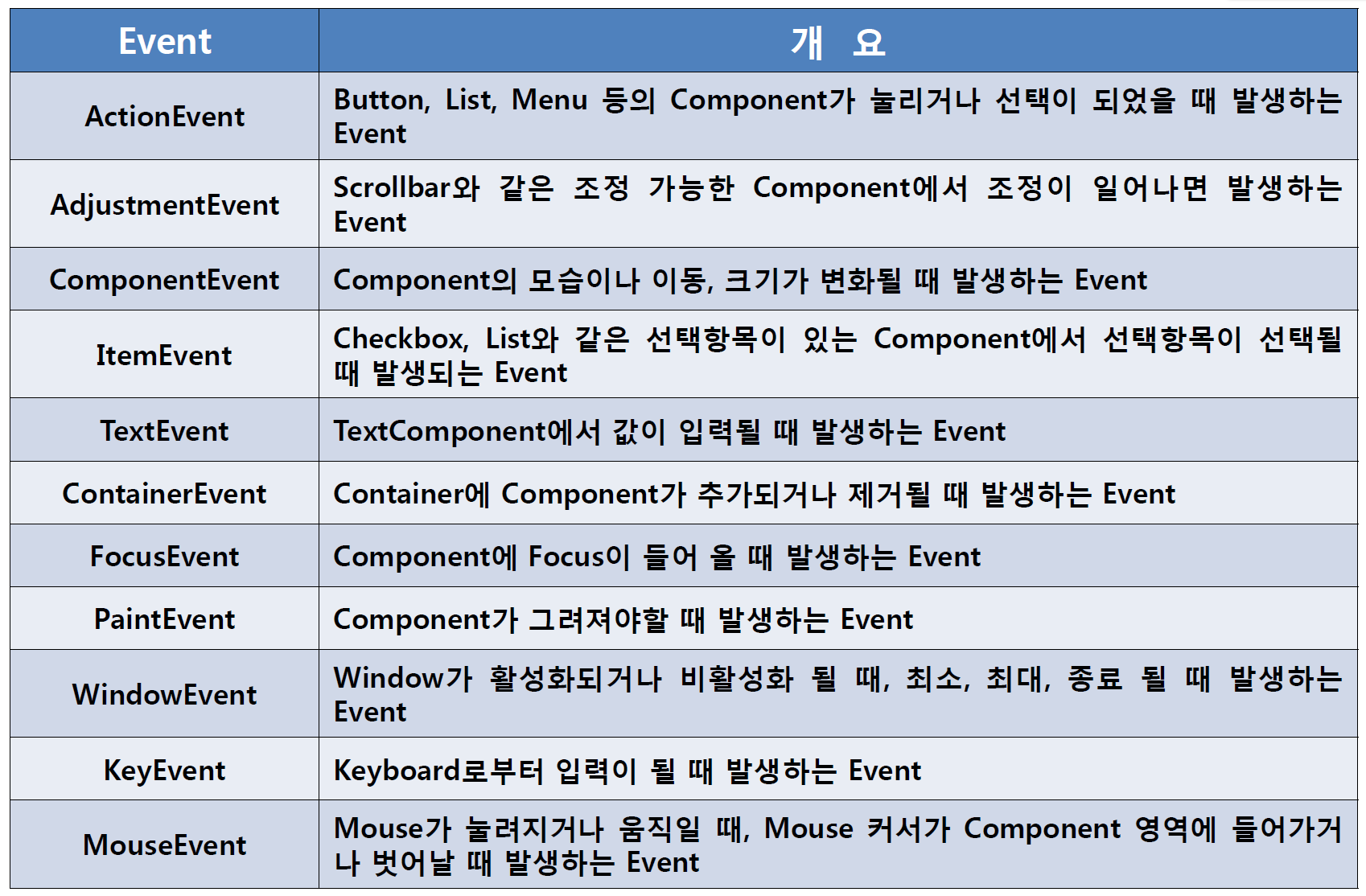// Button은 ActionEvent가 발생하는데, 이벤트 발생시 해당 이벤트 관련 객체가 만들어짐 new ActionEvent()