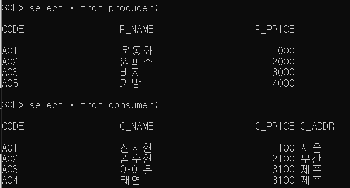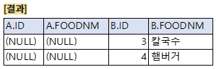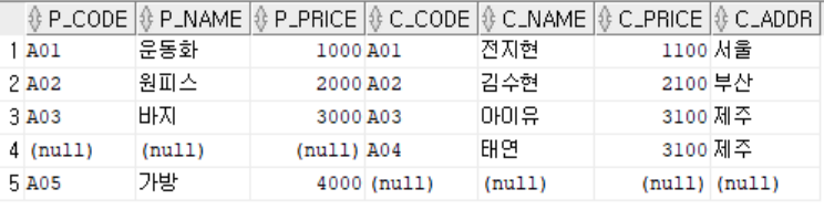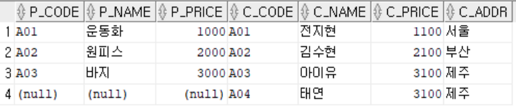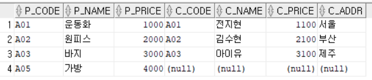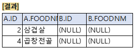 3. full outer 조인 : select 오른편에 나열된 어느 한 쪽의 필드 값도 버리지 않음
