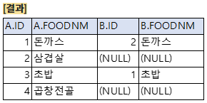 * 왼쪽정보는 다 살리며, 오른쪽에 겹치는게 없다면 해당 값들은 NULL로 처리하여 테이블 생성