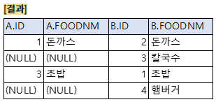 * 오른쪽 정보는 다 살리며, 왼쪽에 겹치는게 없다면 해당 값들은 NULL로 처리하여 테이블 생성