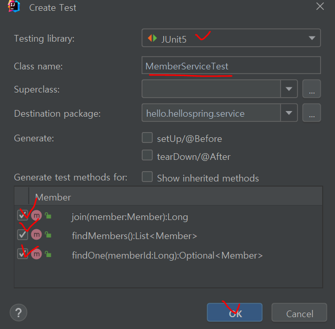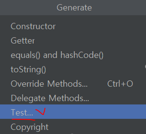 클래스 내부 - 오른쪽 마우스 - Generate... - Test..., Testing library는 JUnit5 선택, 테스트 코드 작성할 메소드 선택 후 OK