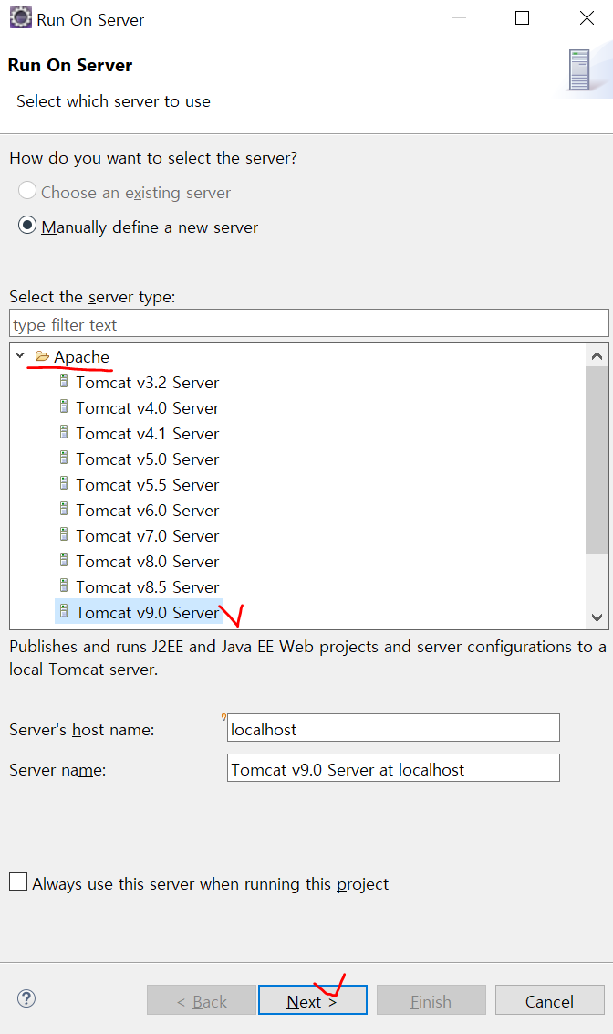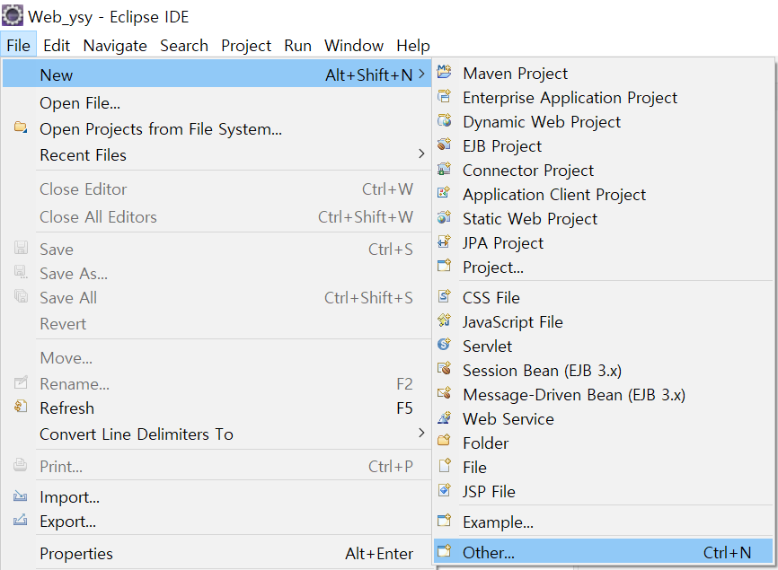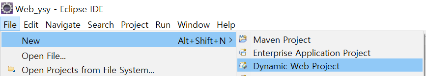 * 톰켓이 설치되고 나면 이클립스에서의 메뉴구성이 살짝 달라지므로 프로젝트를 생성할 때 아래의 방법을 이용해야 한다.