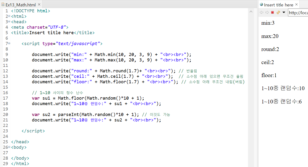 [8주차] 17. 자바스크립트, Math 함수(min, max, round, ceil, floor, random 등) 본문