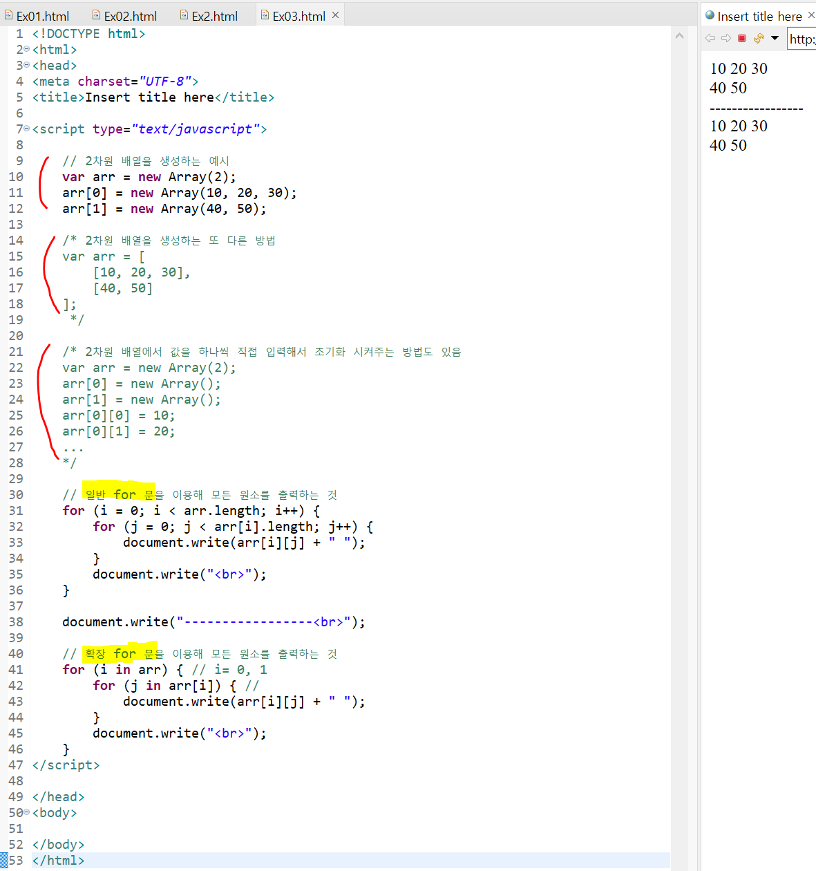 [8주차] 20. 자바스크립트, Array 2차원 배열을 생성하고 원소를 출력하는 방법 본문