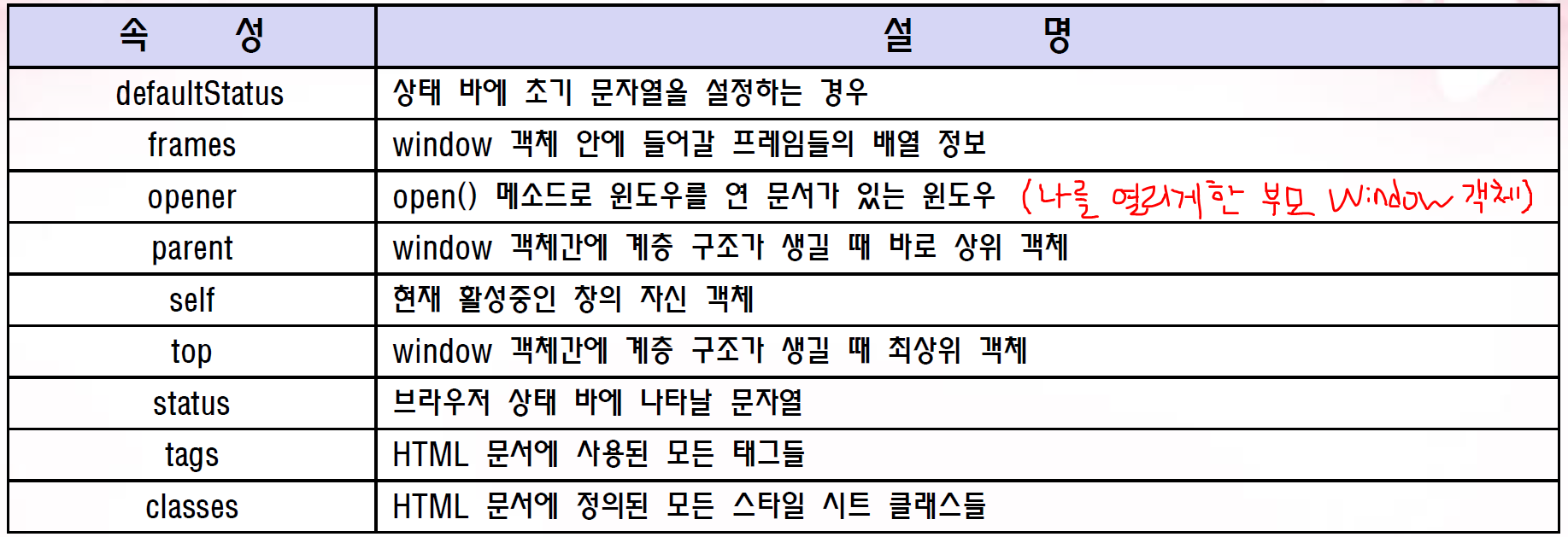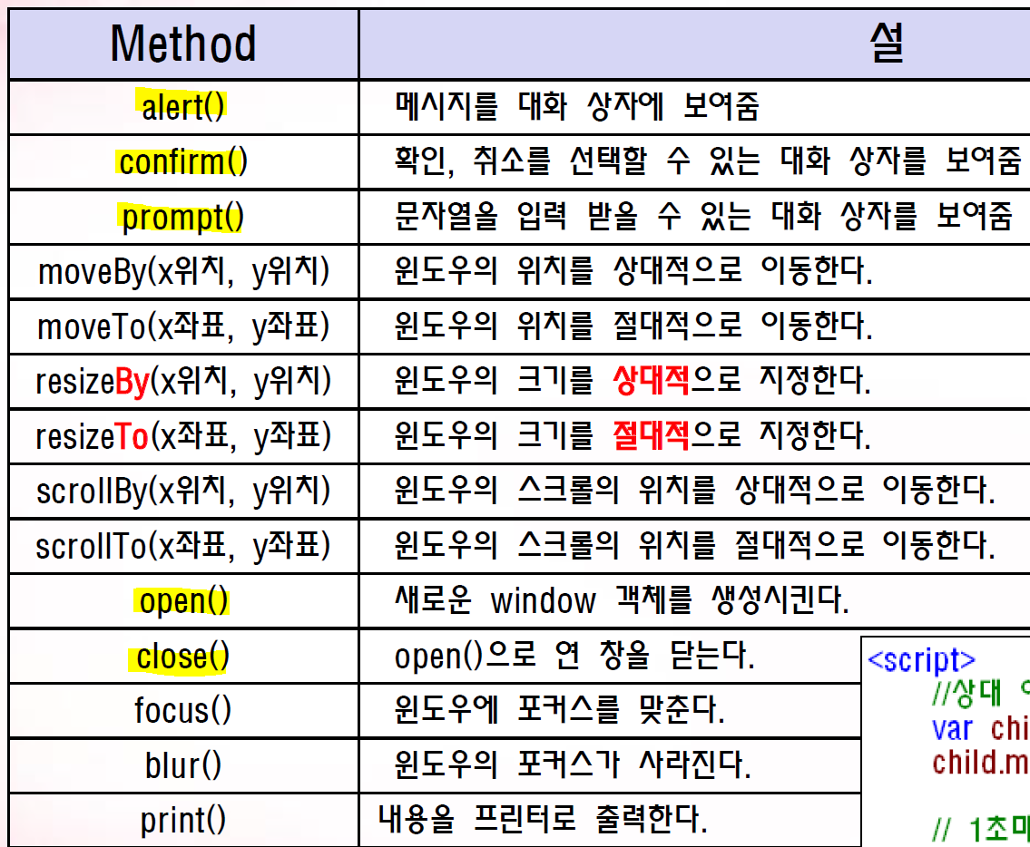 window 객체 : 브라우저 전체를 관리하는 객체로, 새로운 창을 열고 닫고를 수행할 때 사용할 수있음