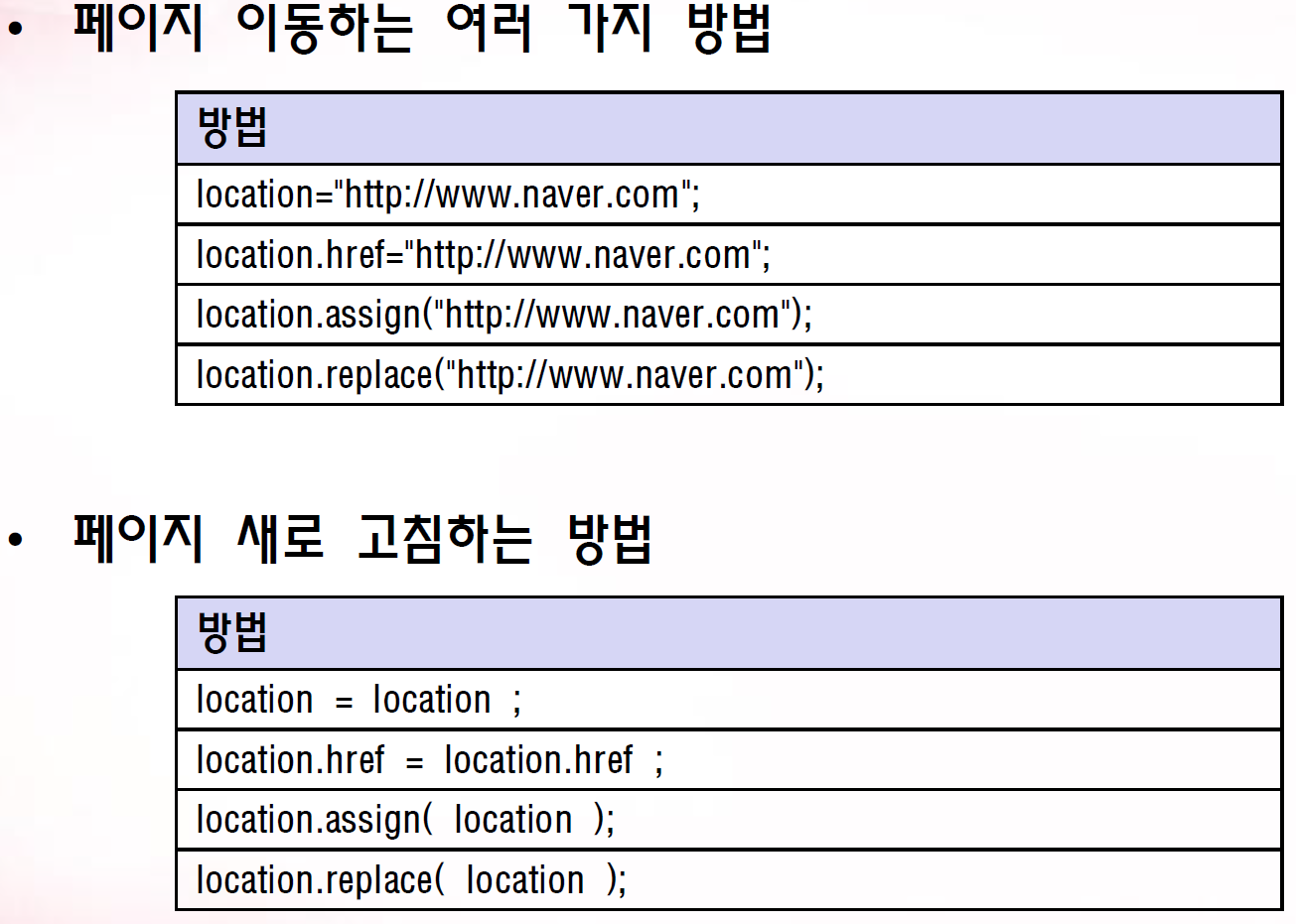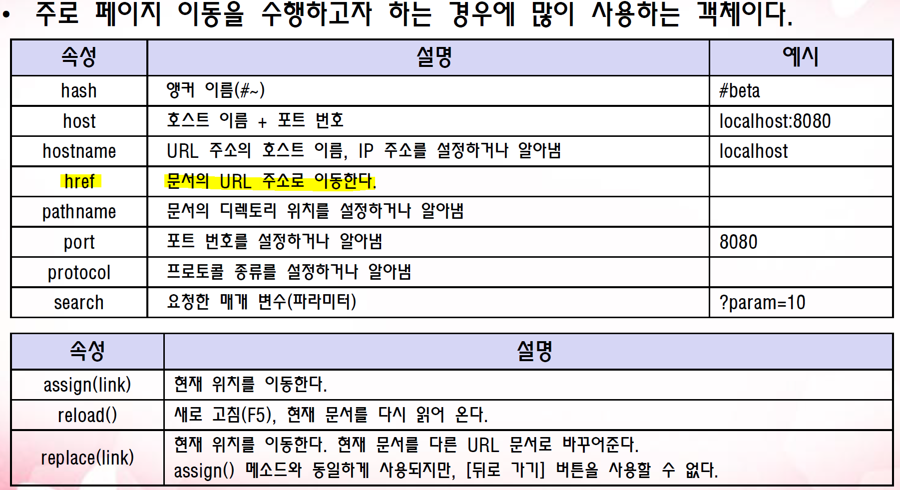 location 객체 : 브라우저의 주소표시줄을 관리하는 객체로, 특정 url로 이동하는것 같은 기능을 수행할 수 있음