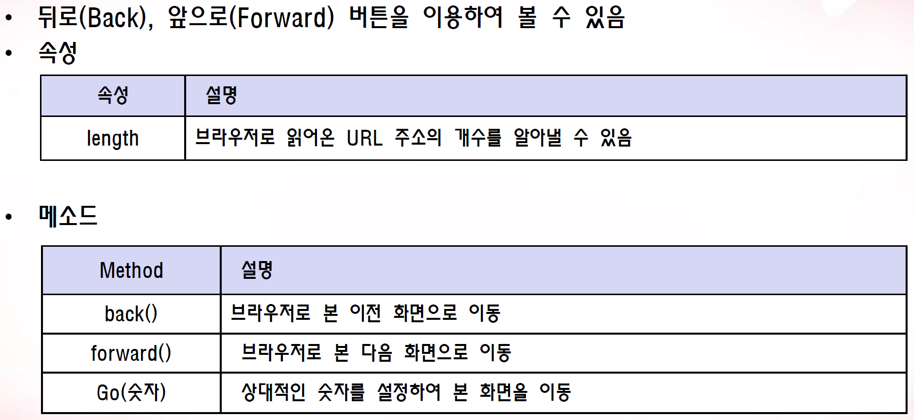 history 객체 : 내가 지나온 url 경로를 기억하는 객체로, 뒤로가기, 더 뒤로가기, 앞으로가기, 더 앞으로가기 등을 수행할 수 있음