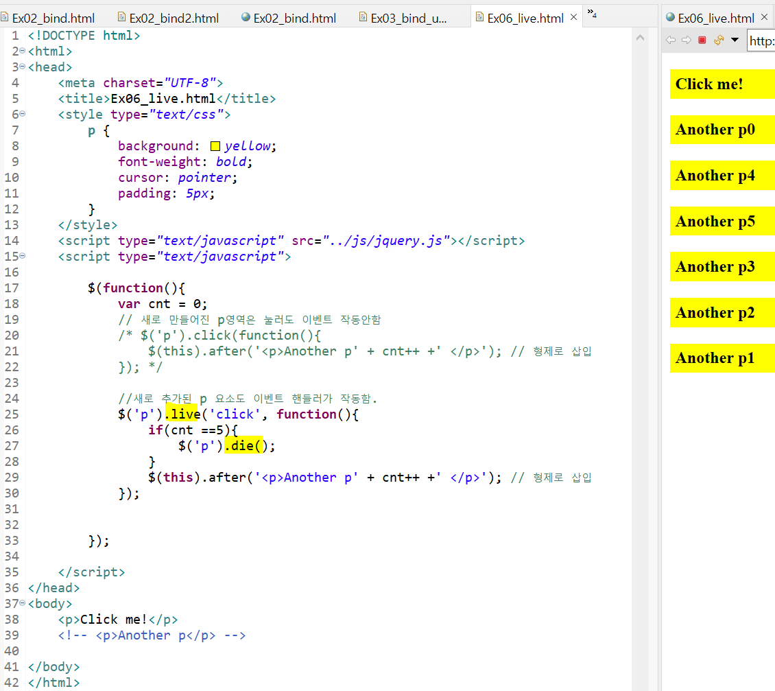 [8주차] 23. 이벤트 핸들러를 붙이거나 제거(새로 추가된 요소에도 위임됨) [ live(), die() ] 본문