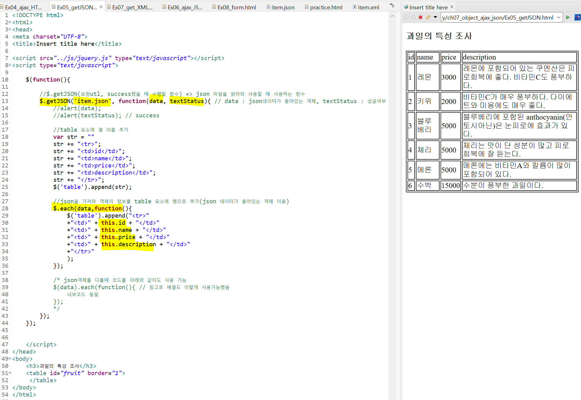 $.getJSON('item.json', function(data, textStatus){ // data : json데이터가 들어있는 객체, textStatus : 성공여부