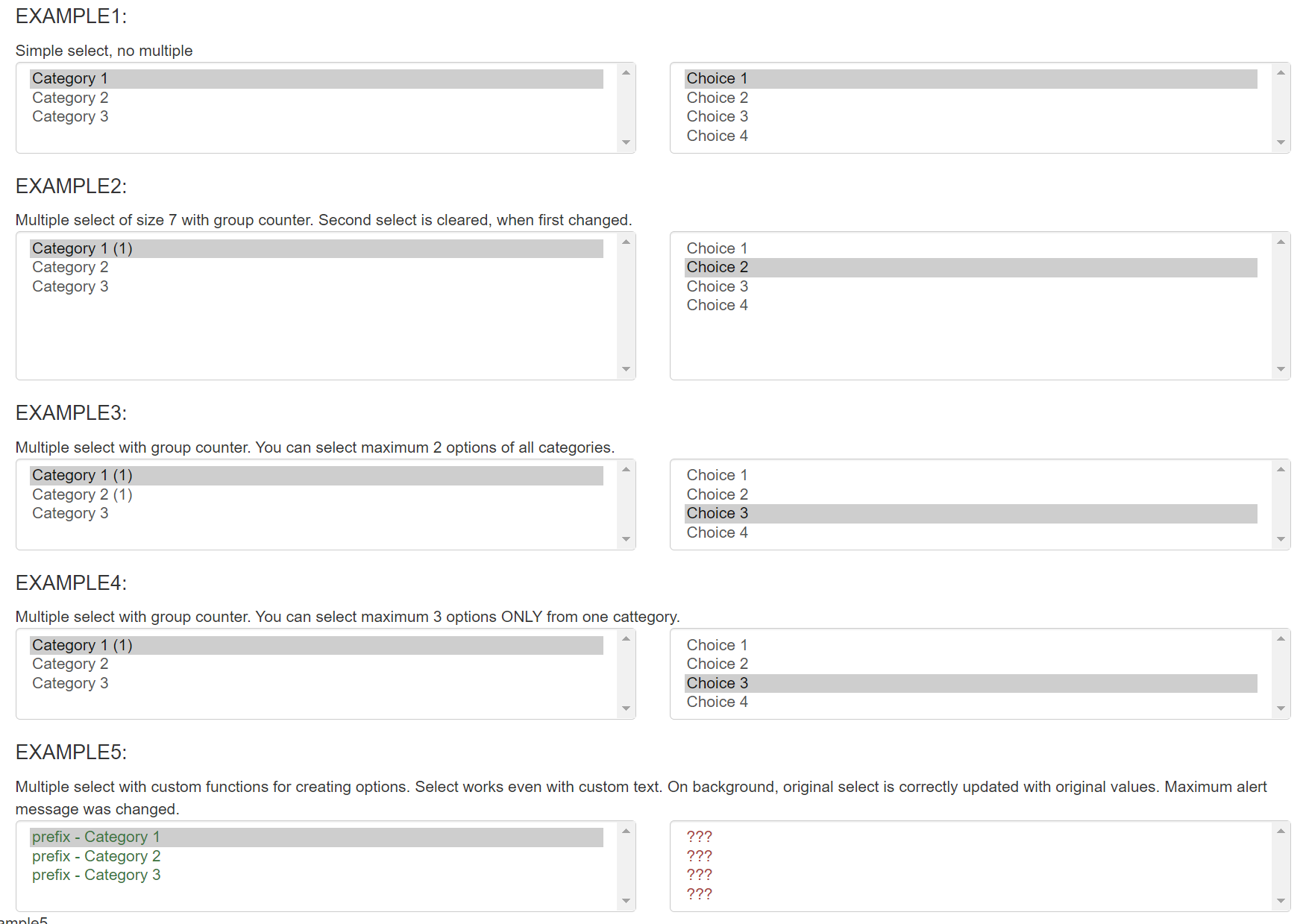 Multiple select with group counter. You can select maximum 2 options of all categories.