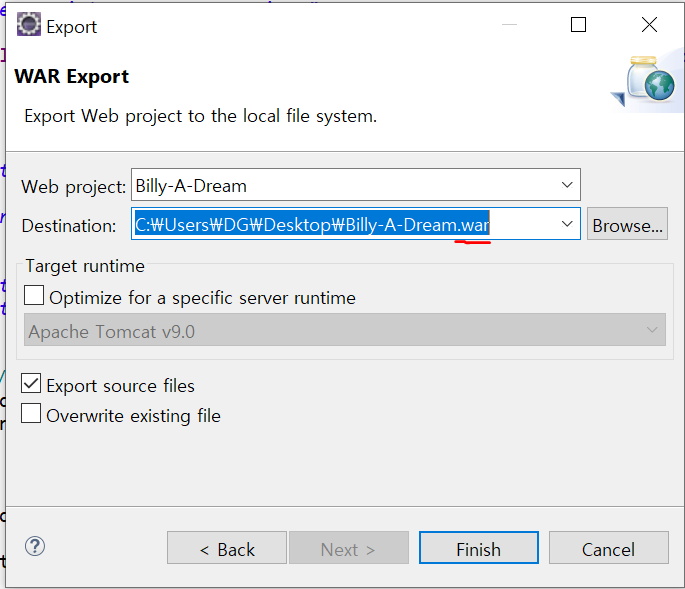* 맨 아래 단계에서 Destination 에 적어줄 때, .war 확장자명을 맨 뒤에 꼭 붙여줘야 정상적으로 동작함에 주의할 것