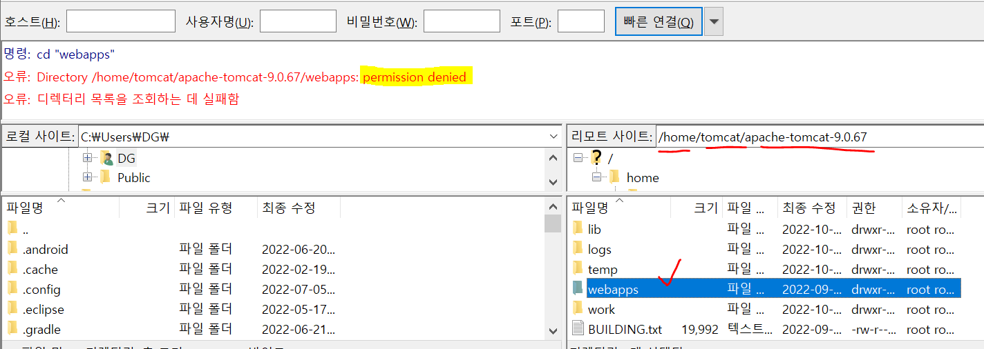 3. FileZilla로 AWS EC2 인스턴스에 업로드 하기2(webapps 폴더 들어가기)