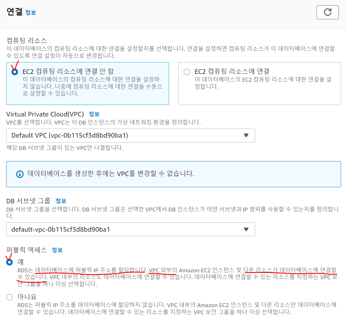 'EC2 컴퓨팅 리소스에 연결 안 함' + 퍼블릭 액세스 '예' 를