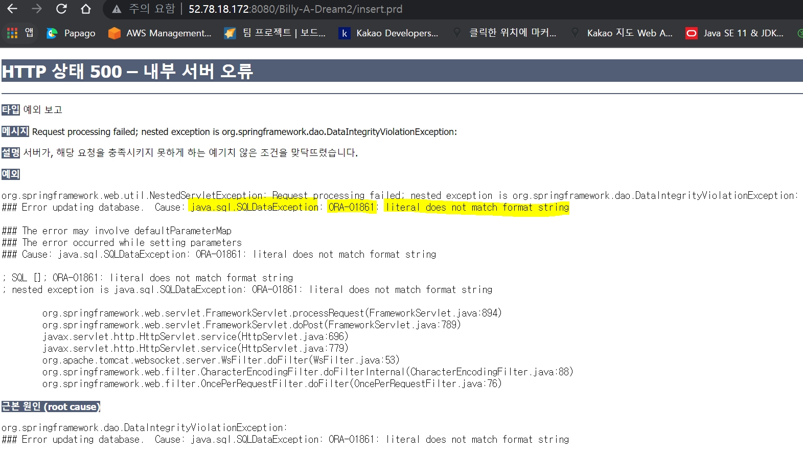 Oracle DB내부에는 NLS_DATE_FORMAT 변수가 있는데, 이 안에는 TO_CHAR() and TO_DATE() 함수가 디폴트로 사용할 날짜형식을 저장하고 있다. 로컬에서는 텍스트로된 날짜가 이 형식과 맞았었는지 따로 to_char(),to_date()를 써주지 않고도 잘 동작 하였는데, AWS RDS 오라클 서버에서는 이 형식이 일치하지 않았나보다.