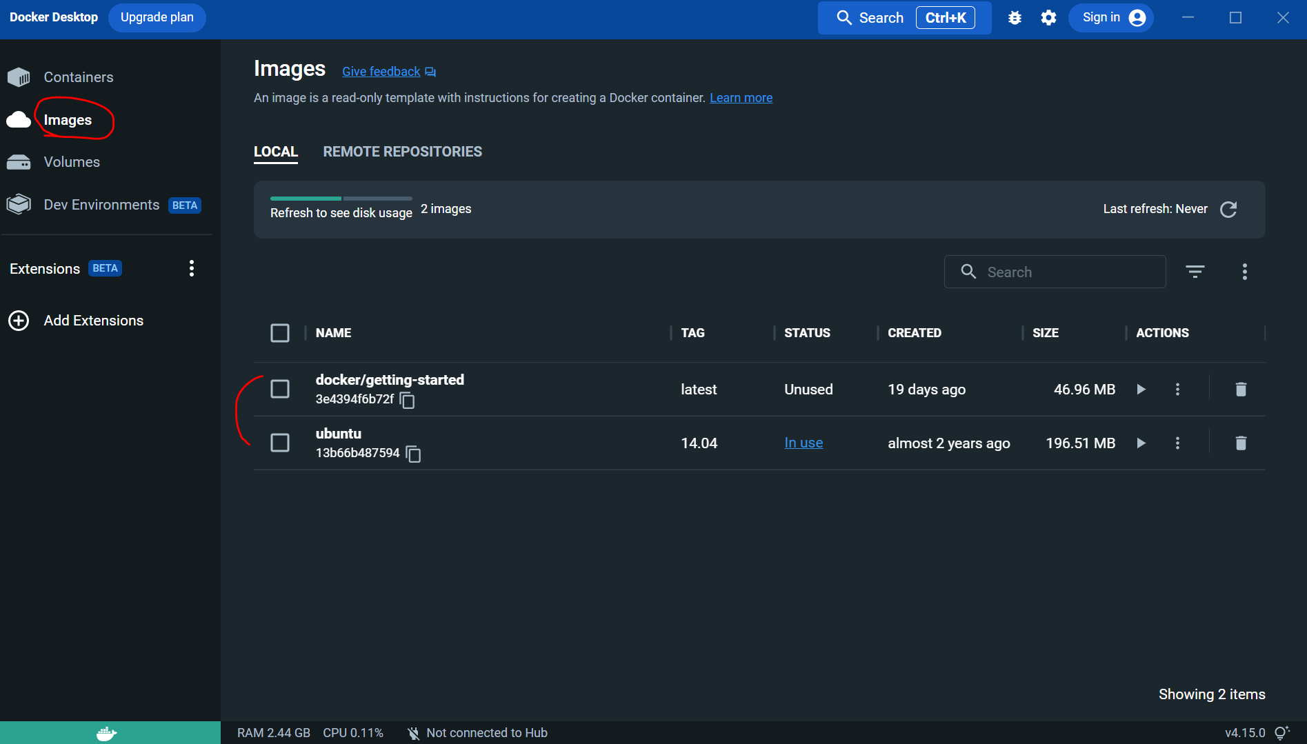 - Image 탭에서는 로컬로 다운받이진 이미지 파일 리스트를 보여준다.