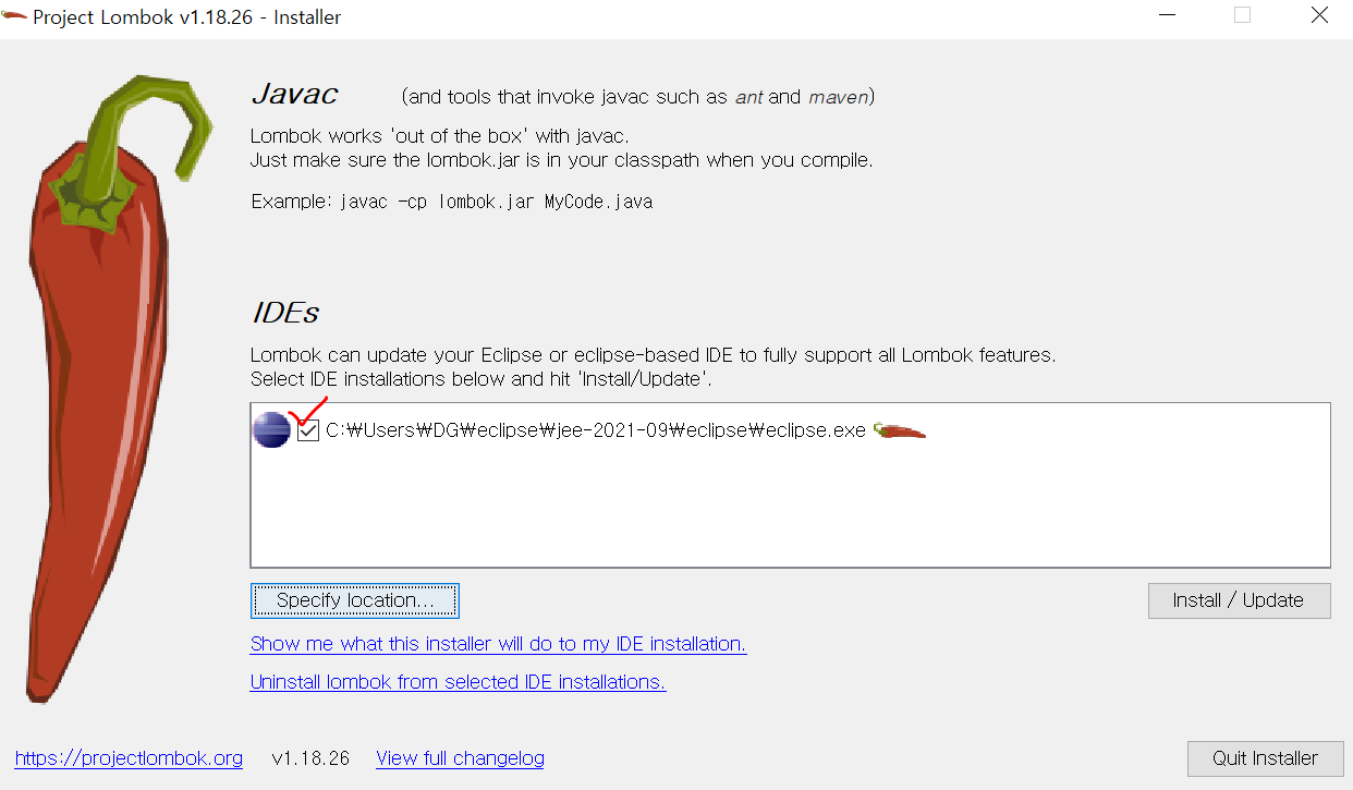 아래 링크에서 lombok.jar 다운받고 실행하여 현재 사용중인 이클립스와 연결해주자.