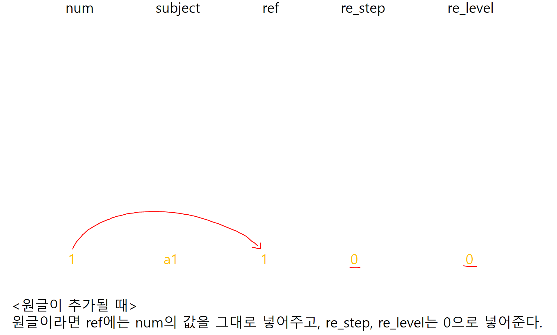 원글이라면 ref에는 num의 값을 그대로 넣어주고, re_step, re_level는 0으로 넣어준다.