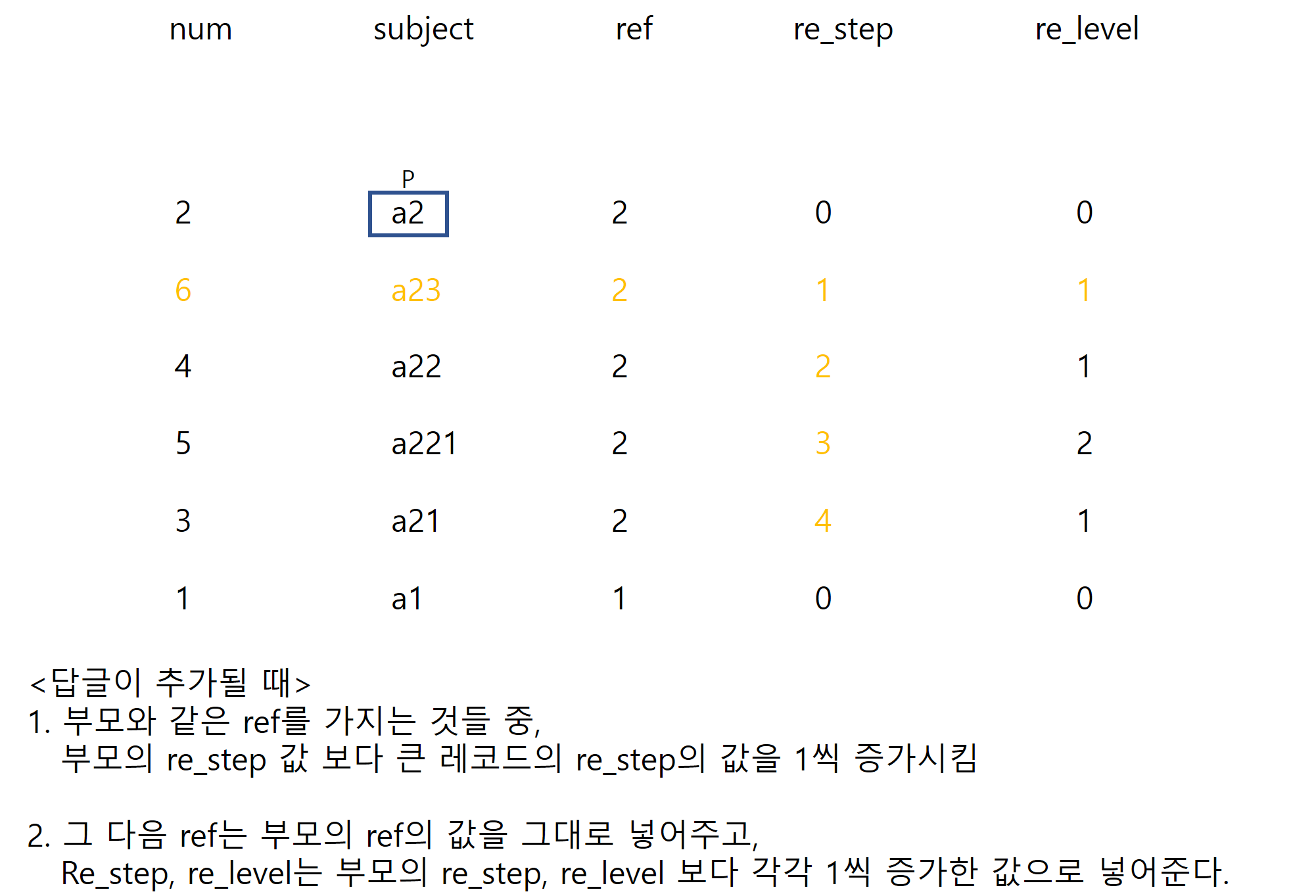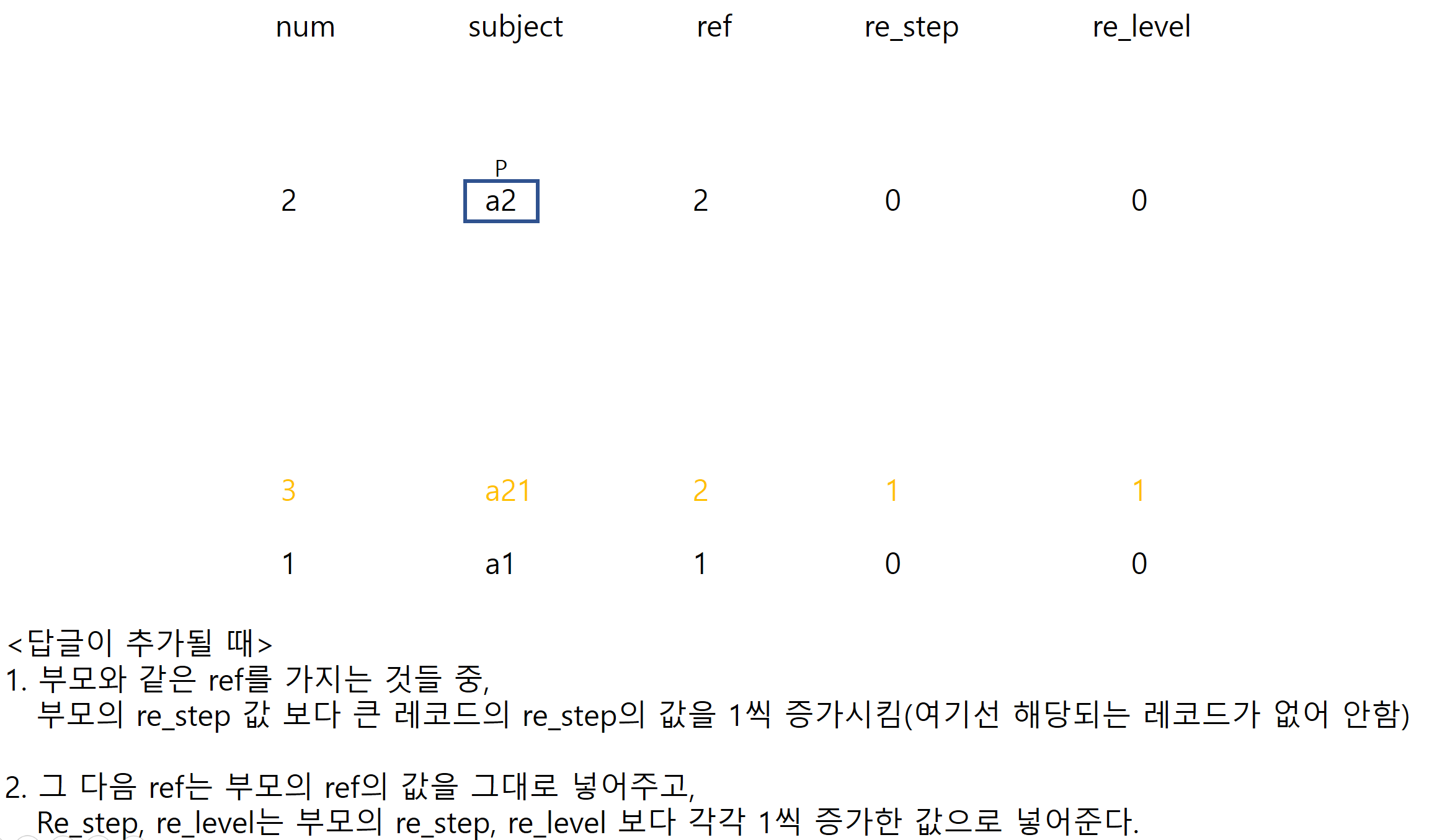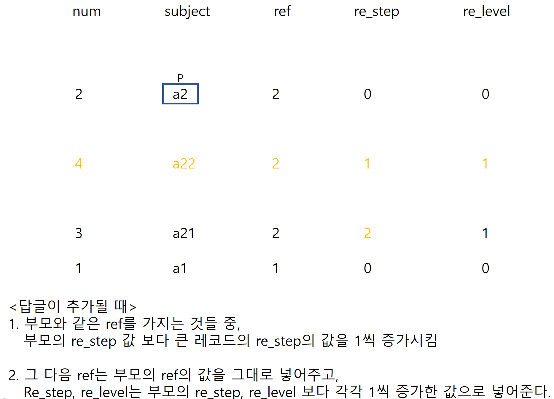 ex) a22: 제목이 a2인 원글에 달린 두번째 답글