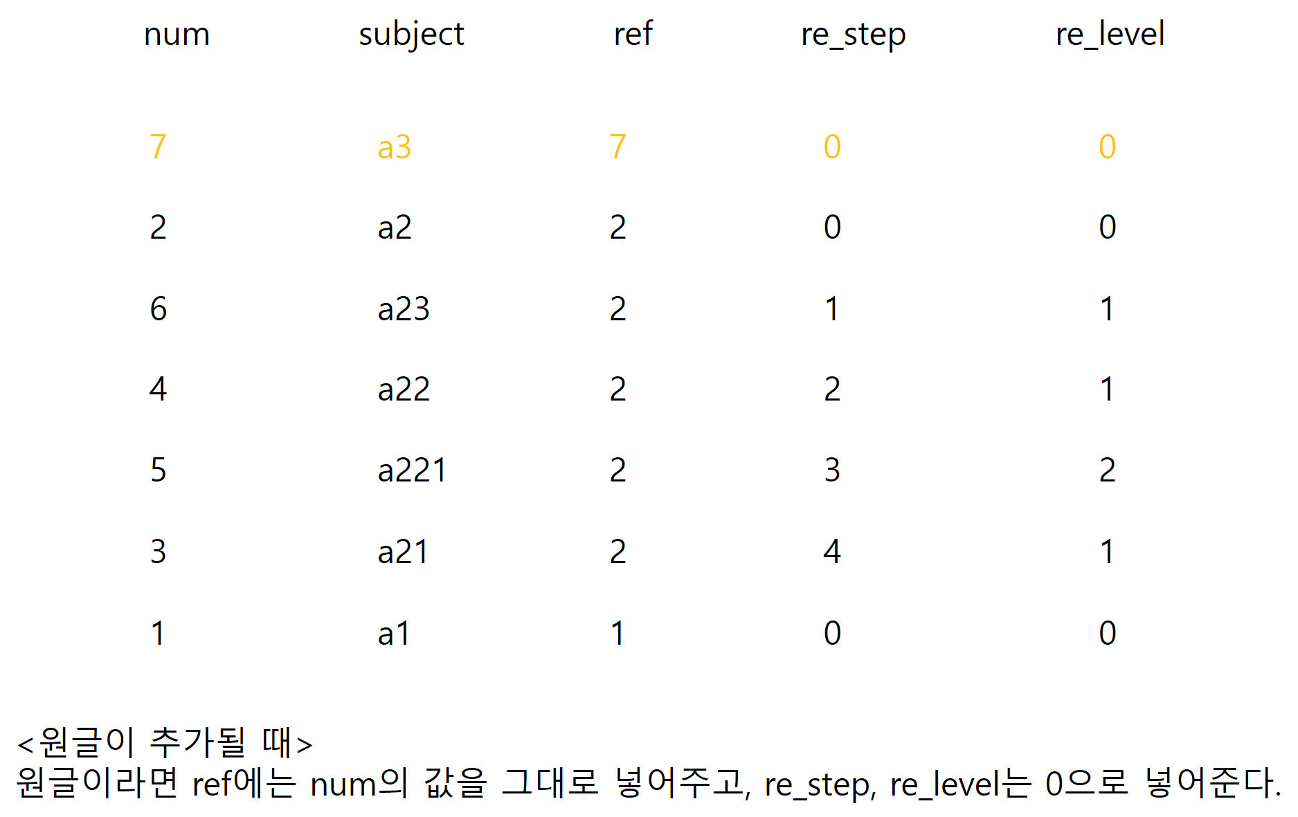 ex) a21: 제목이 a2인 원글에 달린 첫번째 답글